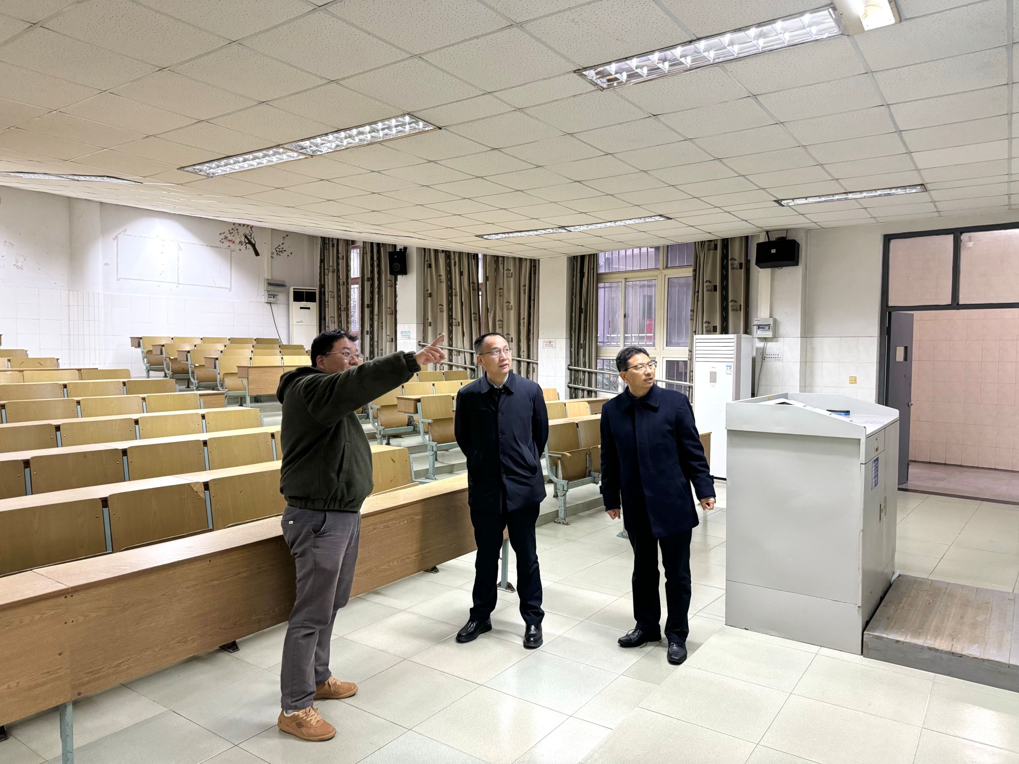 叶林祥副校长一行先后深入校园重点区域,详细察看第四教学楼教室开学准备情况,实地走访学生宿舍、开水房、洗衣房、活动自习室等学生生活学习场所,并对校区行政楼、体育场、电教楼、配电房等关键场馆及设施开展安全隐患全面排查。每到一处,叶林祥副校长都仔细查看环境秩序、设施运行及安全管理情况,对相关工作提出具体要求。