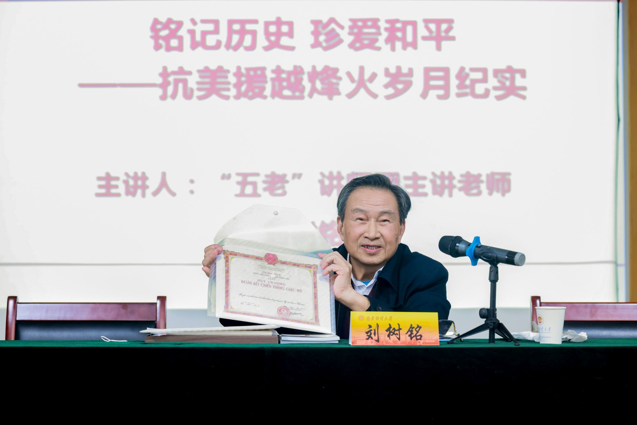 校“五老”讲师团成员刘树铭老师以《铭记历史 珍爱和平》为主题开展党史学习教育,围绕“铭记历史 珍爱和平——抗美援越烽火岁月纪实”展开分享,用朴实的语言还原了抗美援越战场上的炮火硝烟,以及基地值守的孤寂与担当,引导青年学子传承忠诚奉献精神,厚植家国情怀。