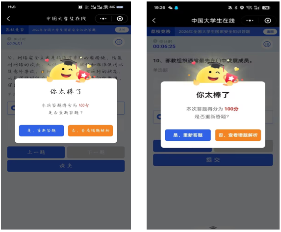 各专业班级组织开展“全国大学生国家安全知识答题”活动。题目紧密围绕《国家安全法》《反间谍法》《网络安全法》等相关法律法规,重点考查同学们对网络安全、校园安全等与自身密切相关的安全知识掌握程度。答题过程中,同学们积极思考、认真作答,既有效检验了学习成效,更巩固了国家安全相关知识,提升了识别安全风险、防范安全隐患的能力。